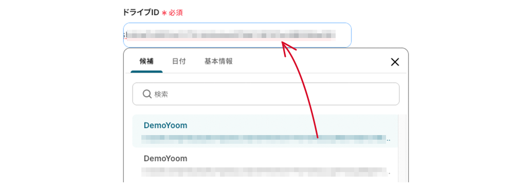 ドライブID 編集欄をクリックすると、プルダウンメニューが表示されます。この中にドライブIDが表示されるので、該当するドライブを選択します。選択すると、編集欄にIDが引用されます。