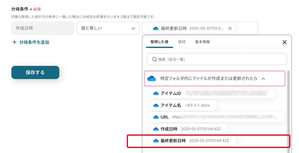 分岐条件 事前設定では、取得したファイルの作成日時とOneDriveの最終更新日時に一致することが条件に指定されています。