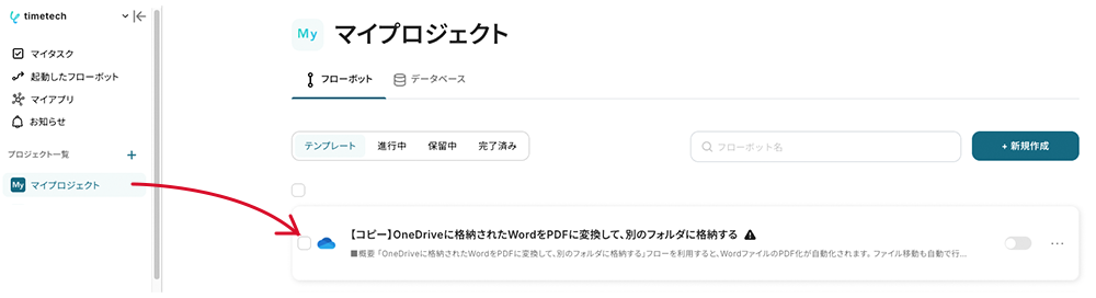 コピーしたテンプレートは、マイプロジェクトに追加されます。マイプロジェクトは左のメニューバーからアクセス可能です。
