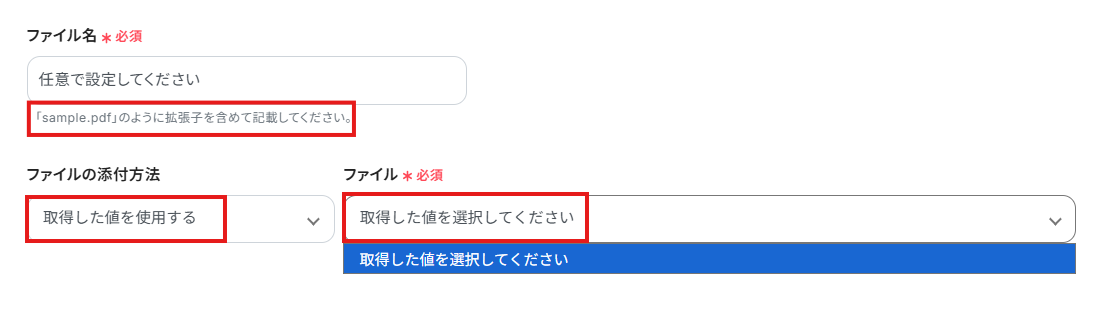 2.API接続設定を行います。 「ファイル名」は、入力欄下の説明に従って任意で設定してください。 「ファイルの添付方法」「ファイル」は、以下画像のようにプルダウンから選択してください。