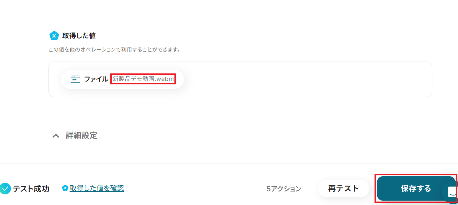 成功したら保存してください。ここで取得したアウトプットの値は次のステップで活用できます。