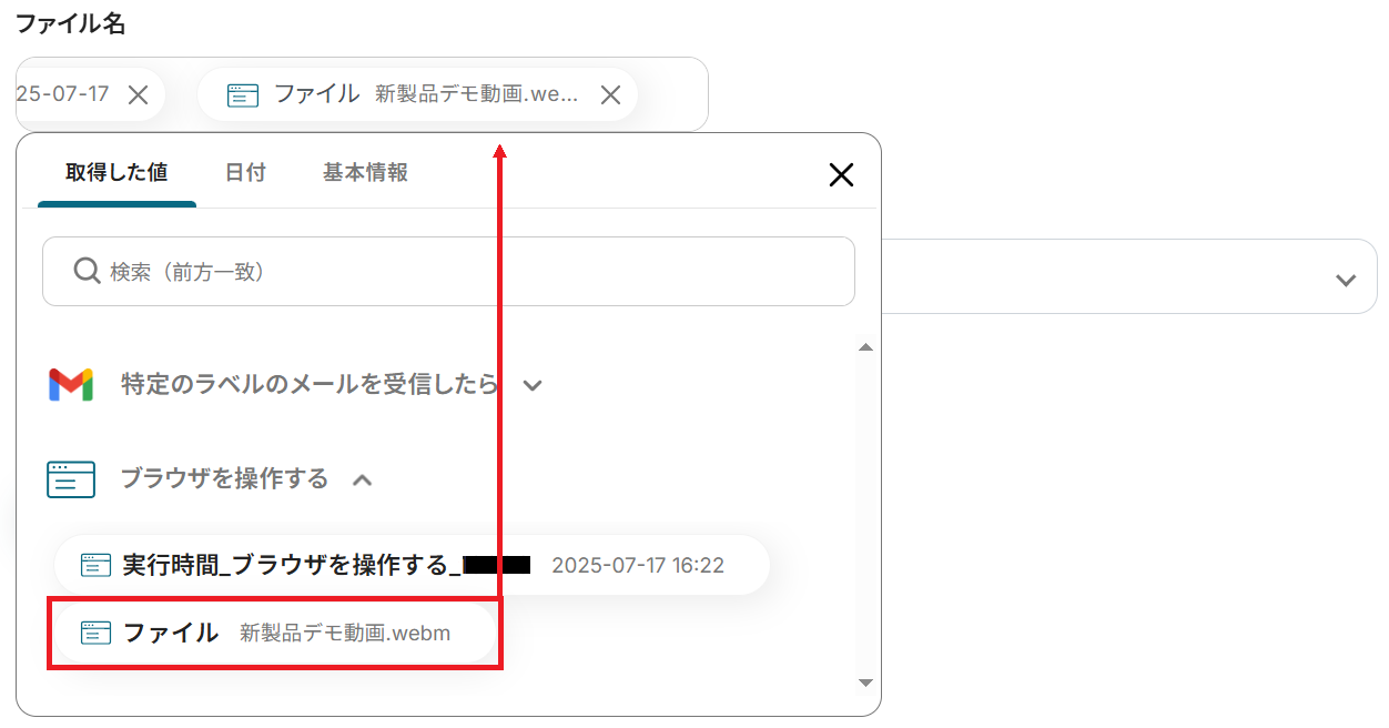 次に「ファイル名」を入力してください。日付や、ステップ4で変換したファイルのアウトプットを選択すると変数として利用できます。