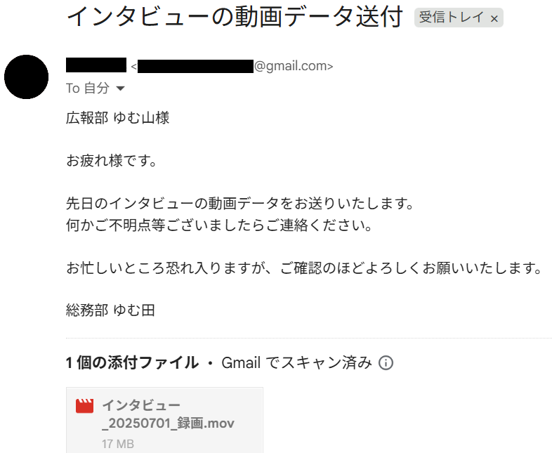 最後に、連携したGmailアドレスに上記のキーワードを含むMOVファイル付きメールを送信しましょう。 今回は以下のように、件名に「動画」というワードが入ったメールを送信しました。