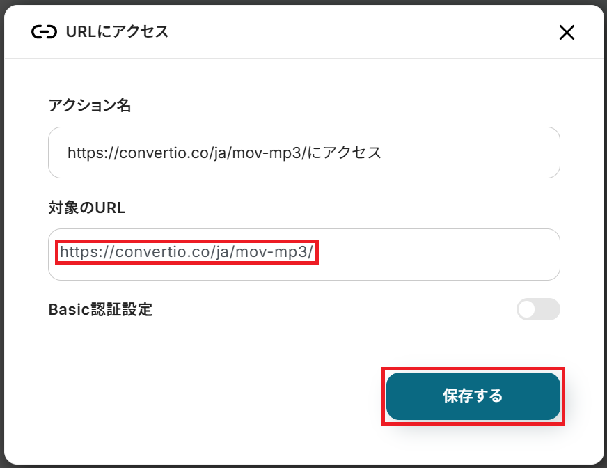 次に「ファイル名」を入力してください。ステップ4で変換したファイルのアウトプットを選択すると変数として利用できます。