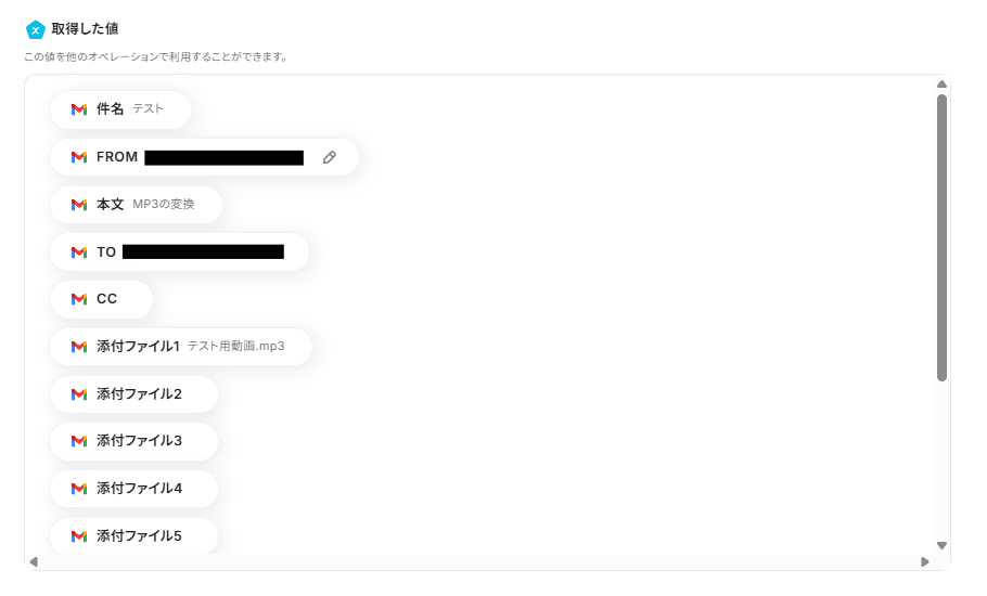 実際にテストメールを送信し、Yoomで「テスト」をクリックしましょう。 以下の画面のようにアウトプットにメールの内容が表示されます。 この後、この取得した値の内容を入力に使用することができます。 ※取得した値に関して、詳しくはこちら をご確認ください。