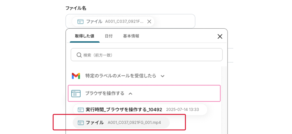 ファイル名 事前設定で、前の操作で取得できるファイル名の引用コードが埋め込まれています。このコードも、フィールドをクリックして表示するプルダウンメニュー内に格納されています。
