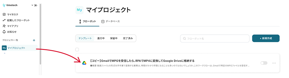 コピーしたテンプレートは、マイプロジェクトに追加されます。マイプロジェクトは左のメニューバーからアクセス可能です。