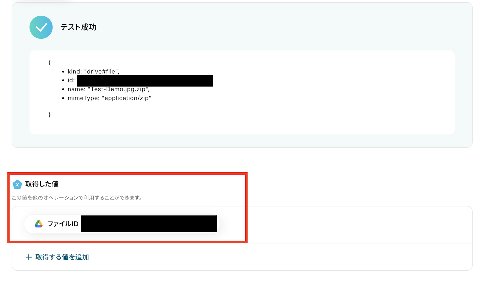 6.「テスト成功」と表示されたら、Google Driveにアップロードができたサインです。