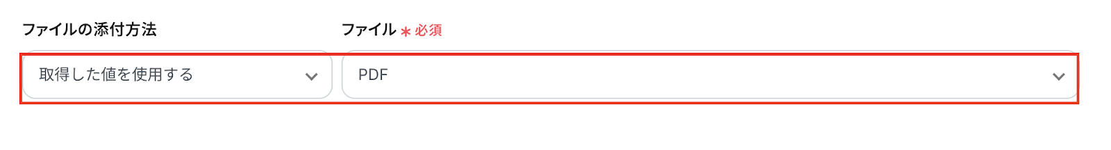 ファイルの添付方法は「取得した値を使用する」、ファイルは「PDF」を選択してます。