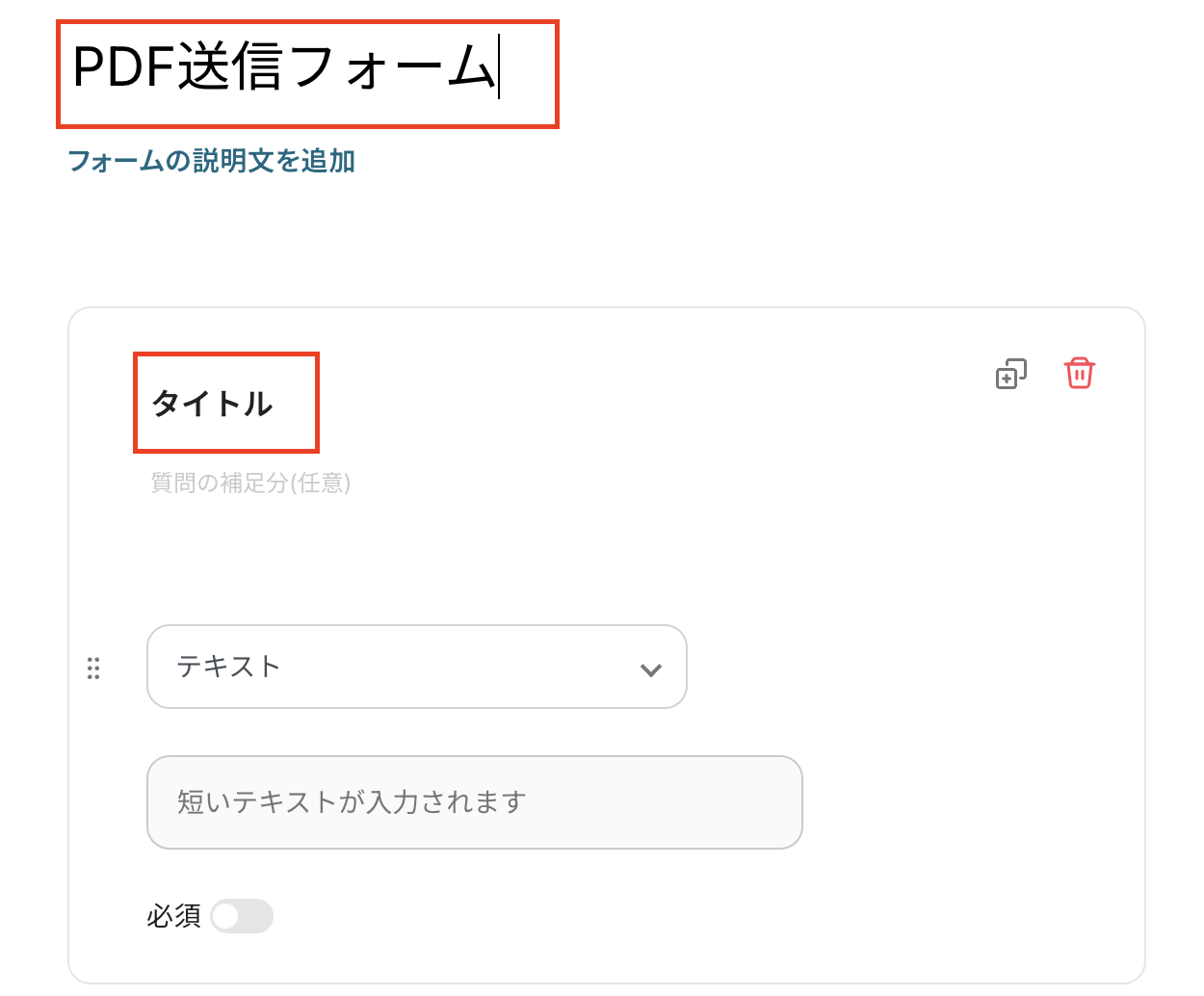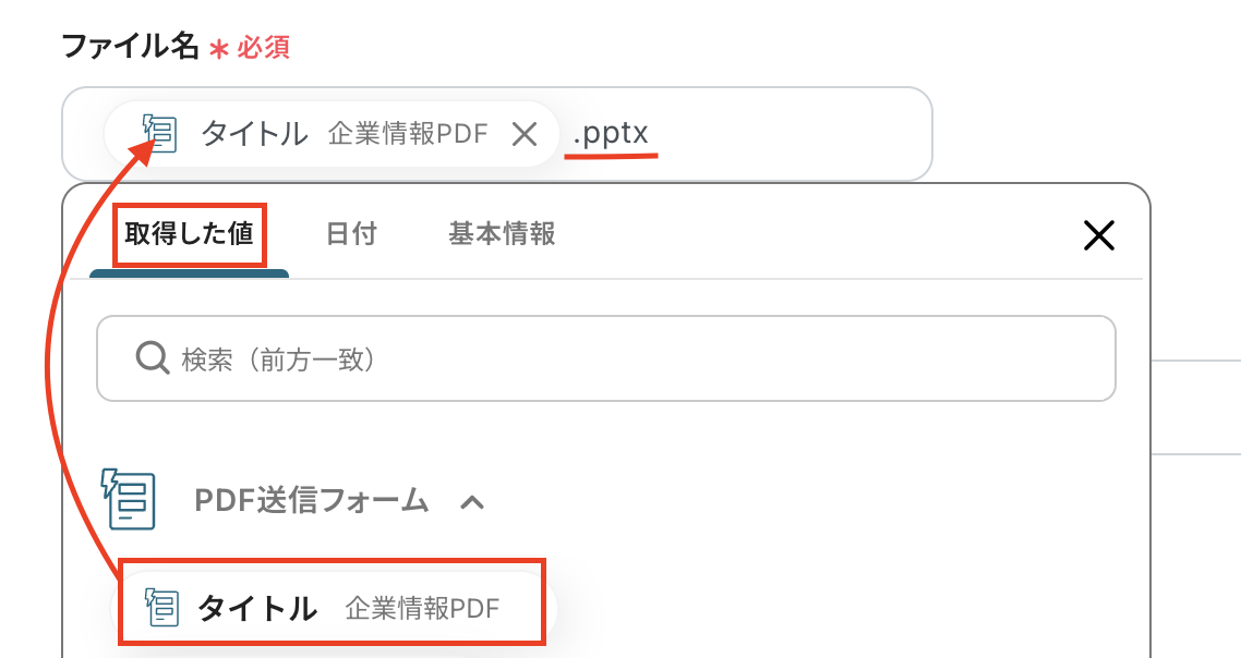 ファイル名はフォームトリガーの取得した値から「タイトル」を選択してください。