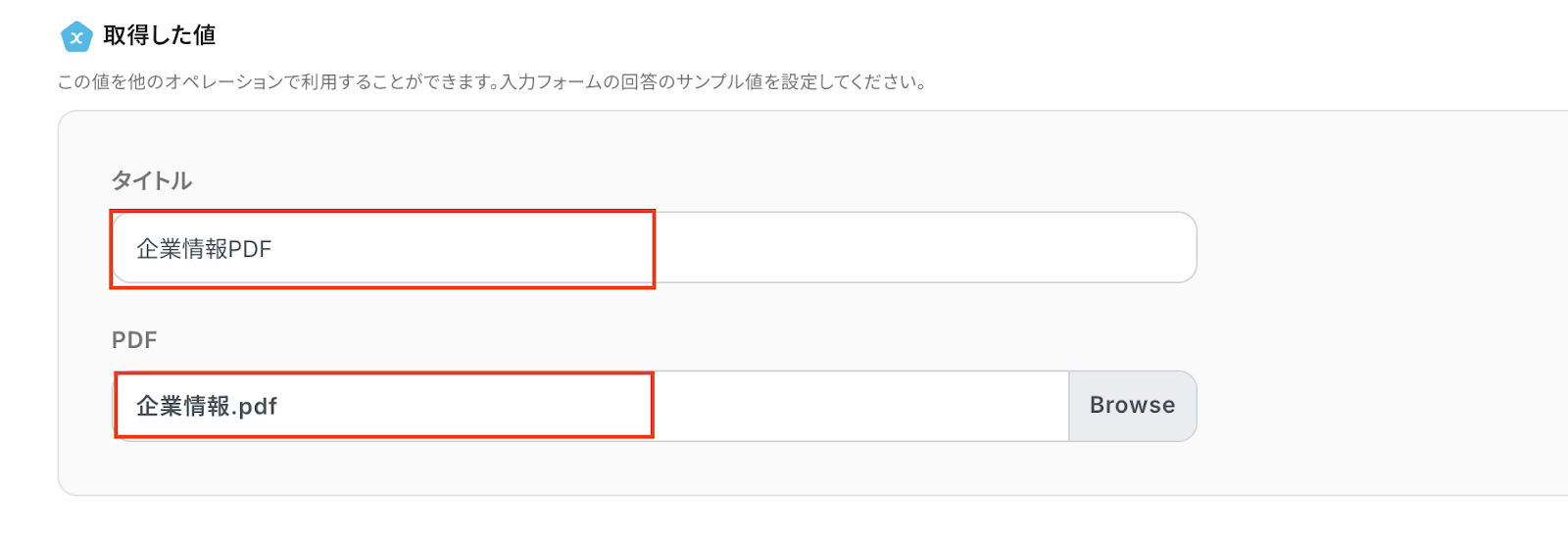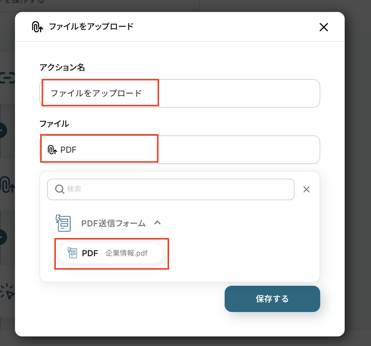 ファイルは、フォームトリガーで取得した「PDF」を選択しましょう。