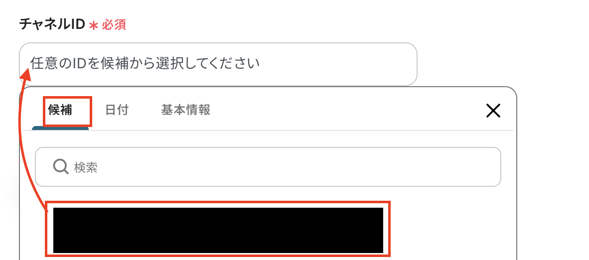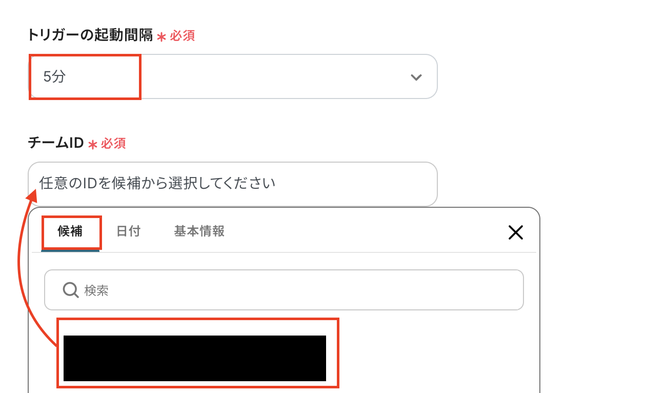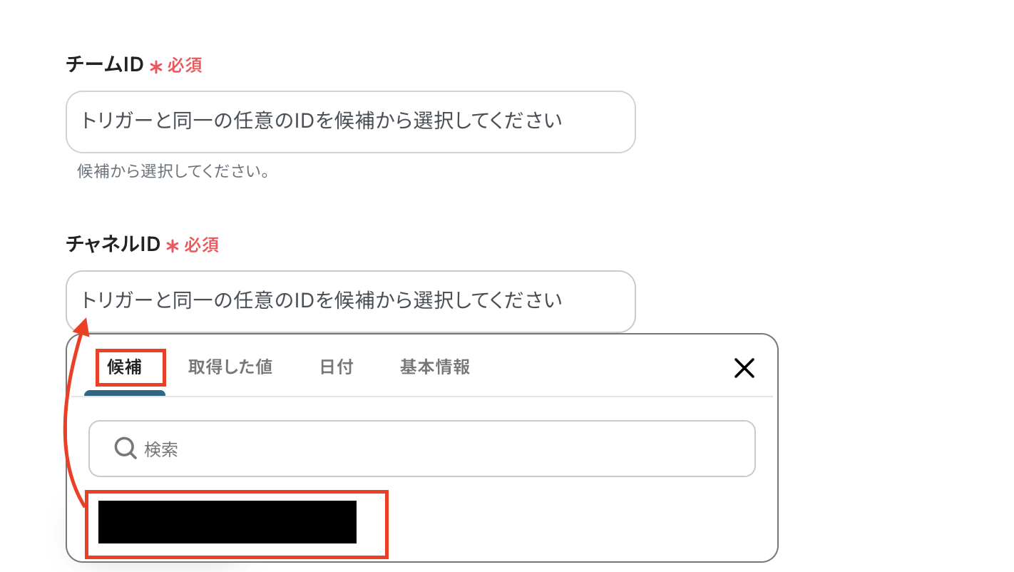 チームIDは候補から選択します。(候補には、利用しているMicrosoft Teamsのチーム名とIDが一覧で表示されます)