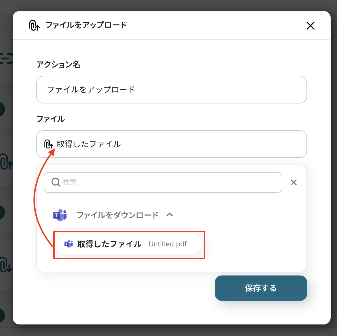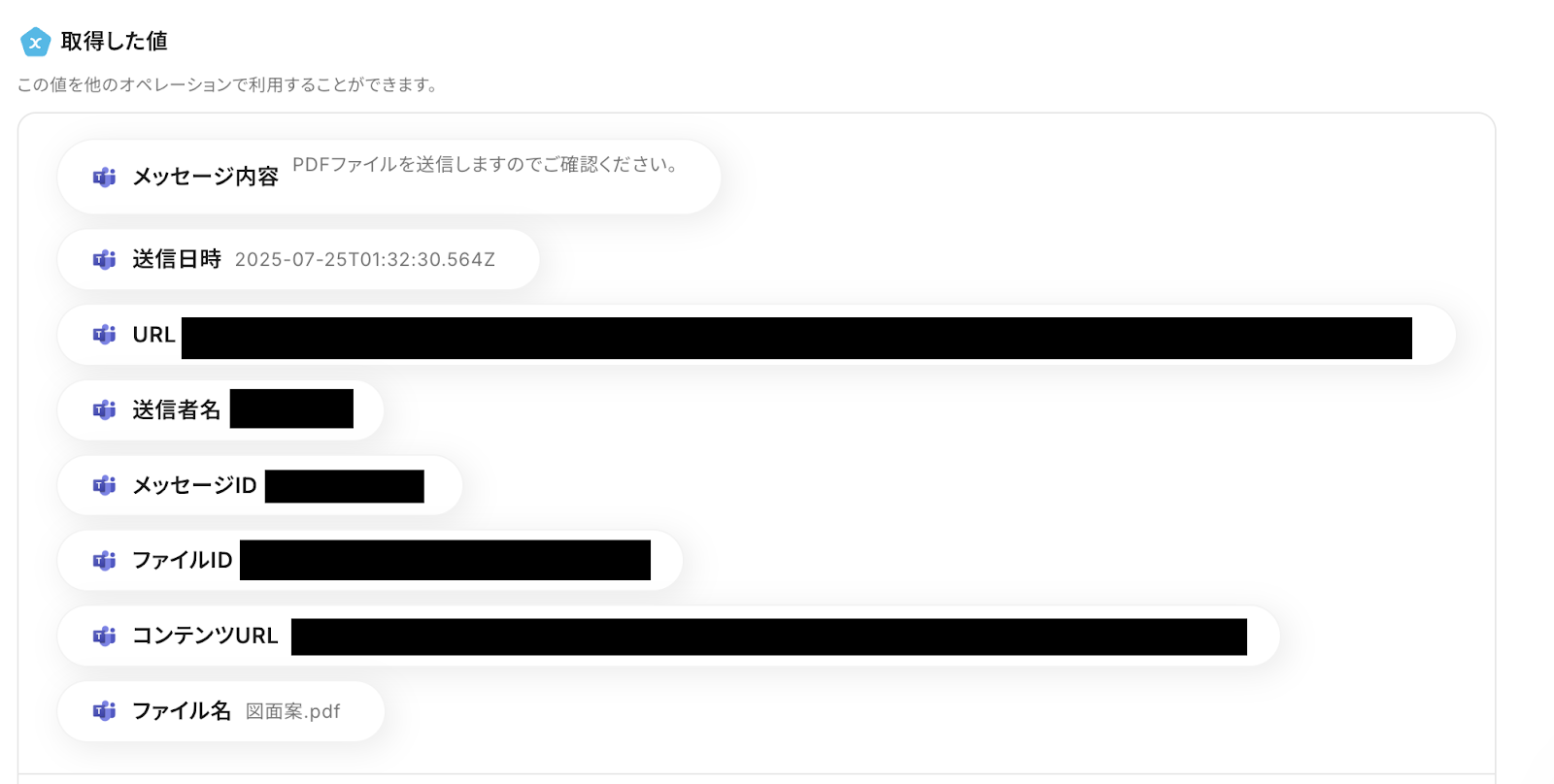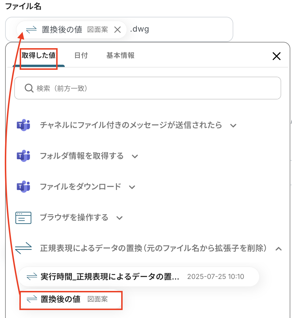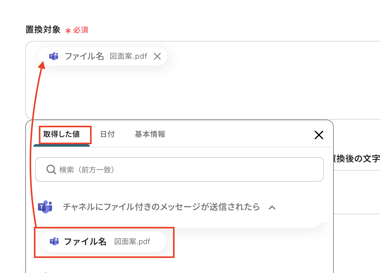 置換対象には、Microsoft Teamsのトリガー設定で取得した値から「ファイル名」を選択してください。