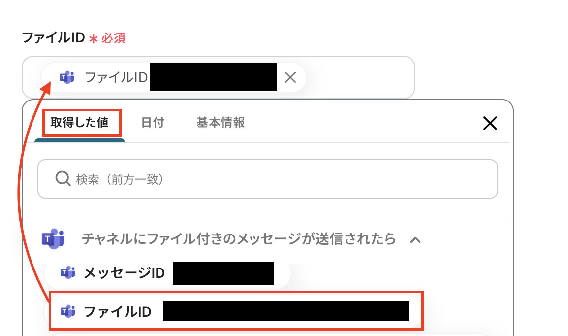 ファイルIDは、ステップ3のトリガー設定で取得した値から「ファイルID」を選択しましょう。