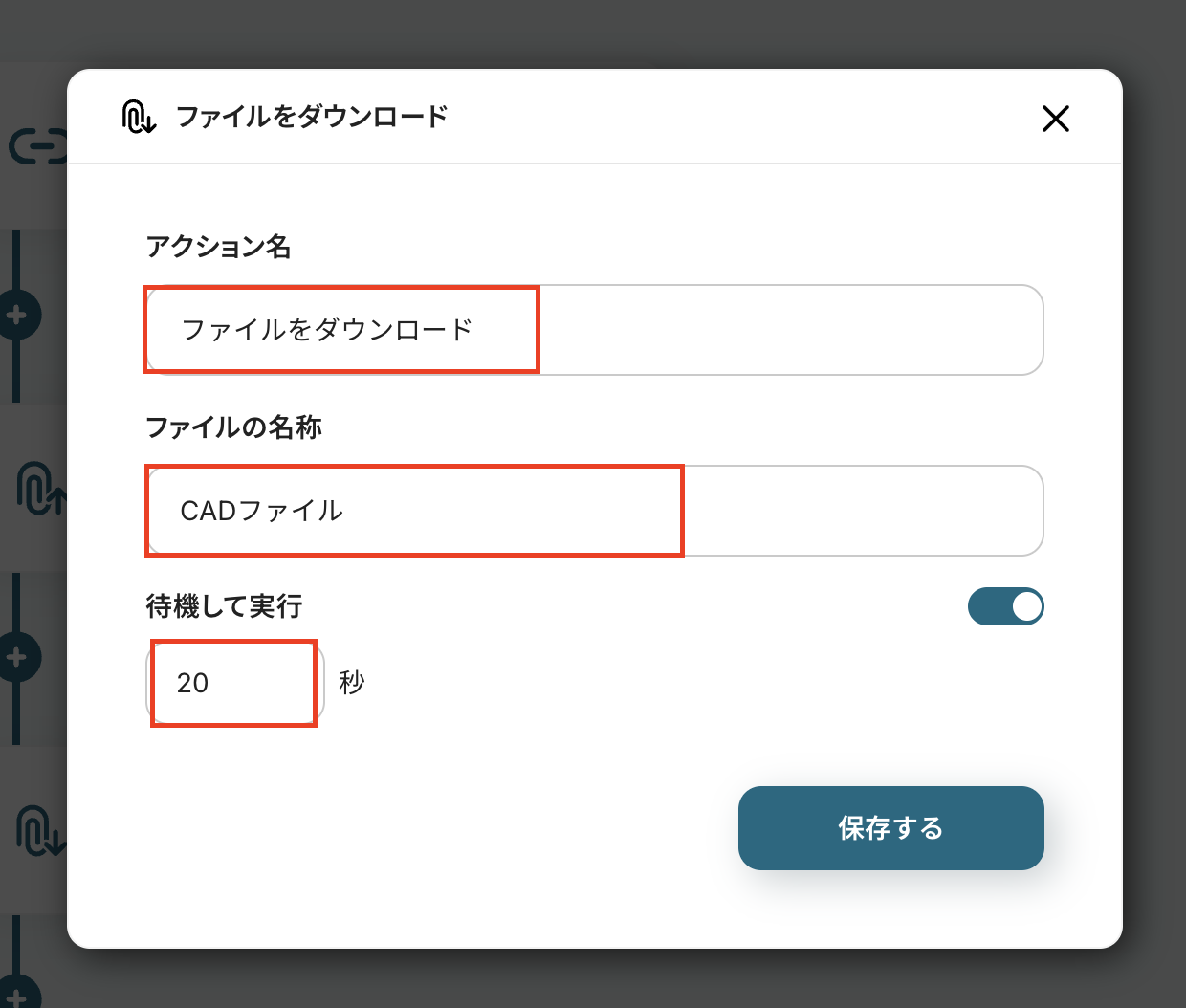 待機して実行は、ファイルをダウンロードする時に必要な時間を入力してください。