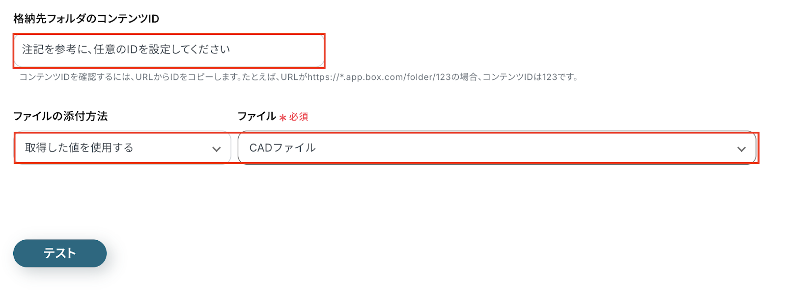 ファイルの添付方法は「取得した値を使用する」、ファイルは「CADファイル」(ステップ6で取得した値)を選択し、テストをクリックします。