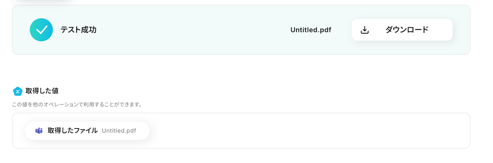 ファイルは、ステップ5のファイルをダウンロード設定で取得した値から、「取得したファイル」を選択してください。