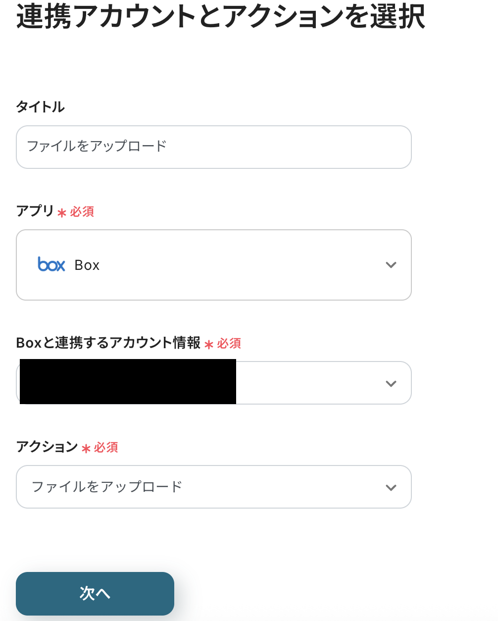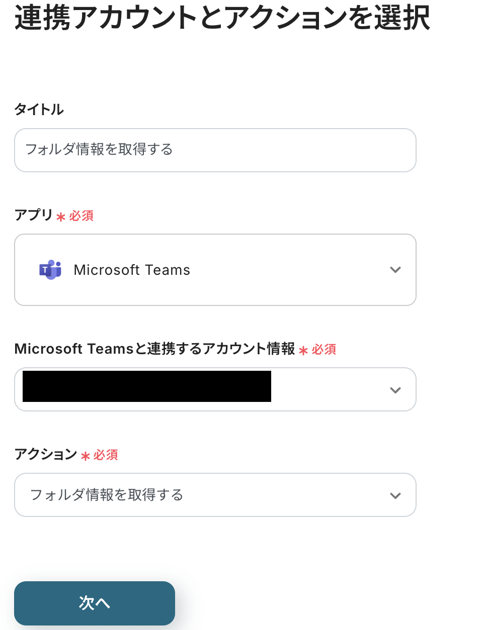 「連携アカウントとアクションを選択」は設定ができているので、確認後、次へをクリックします。