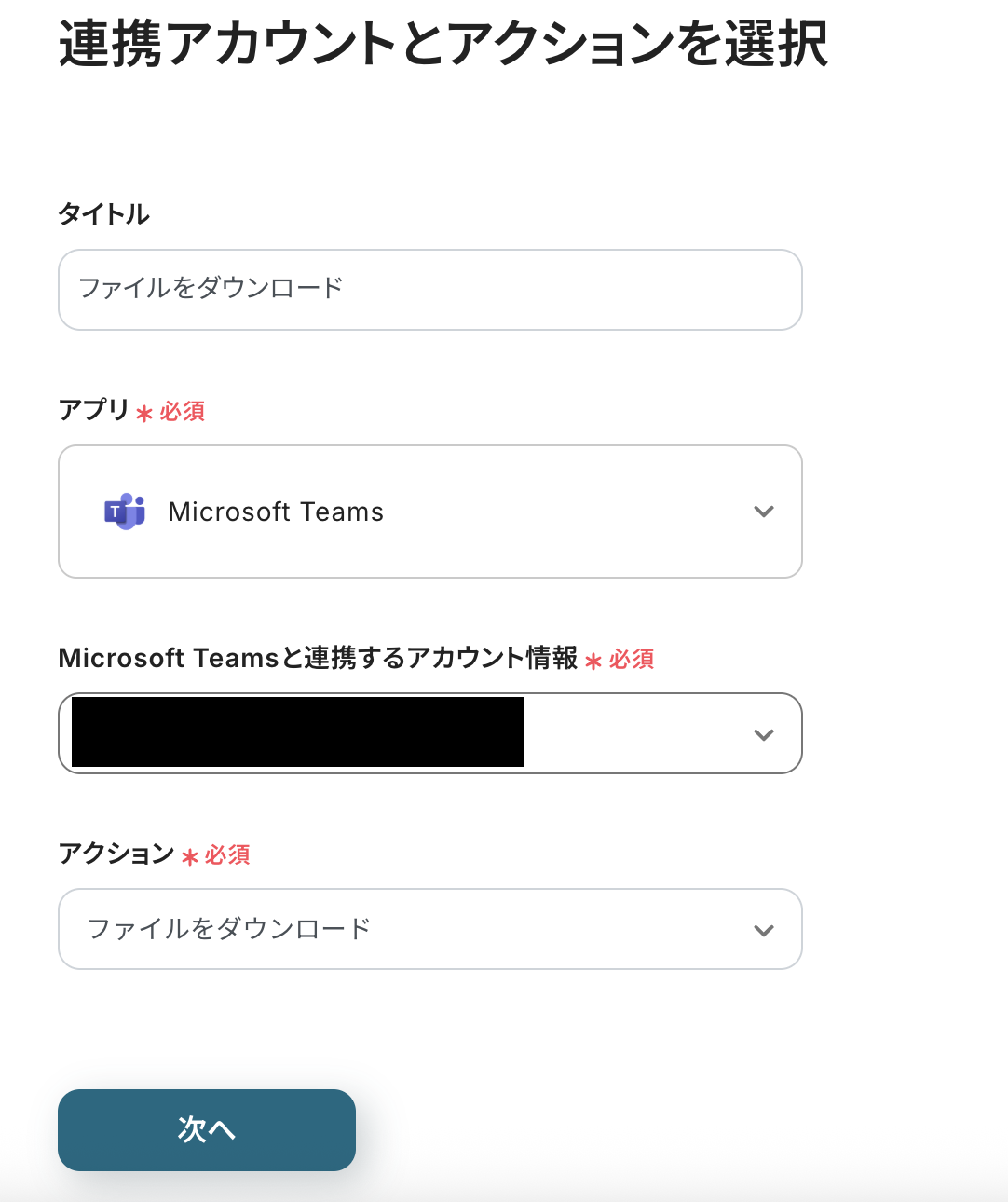 「連携アカウントとアクションを選択」は設定が完了しているので、確認して「次へ」を選択します。
