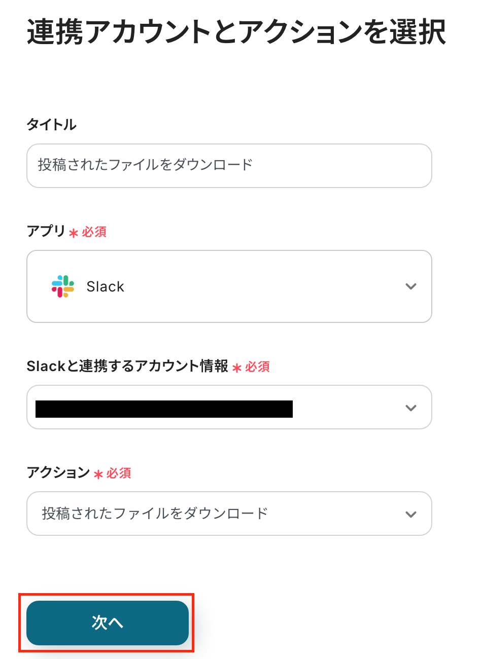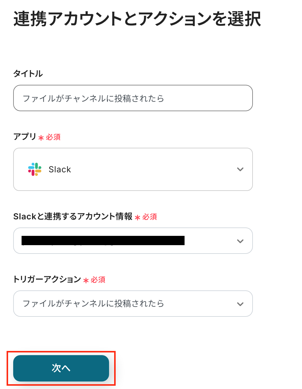 以下の画面に遷移したら、タイトルとアクションは任意で設定し、連携するアカウント情報を確認しましょう。