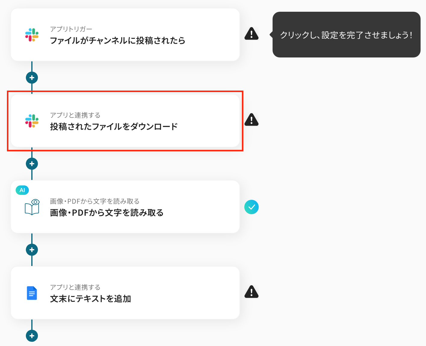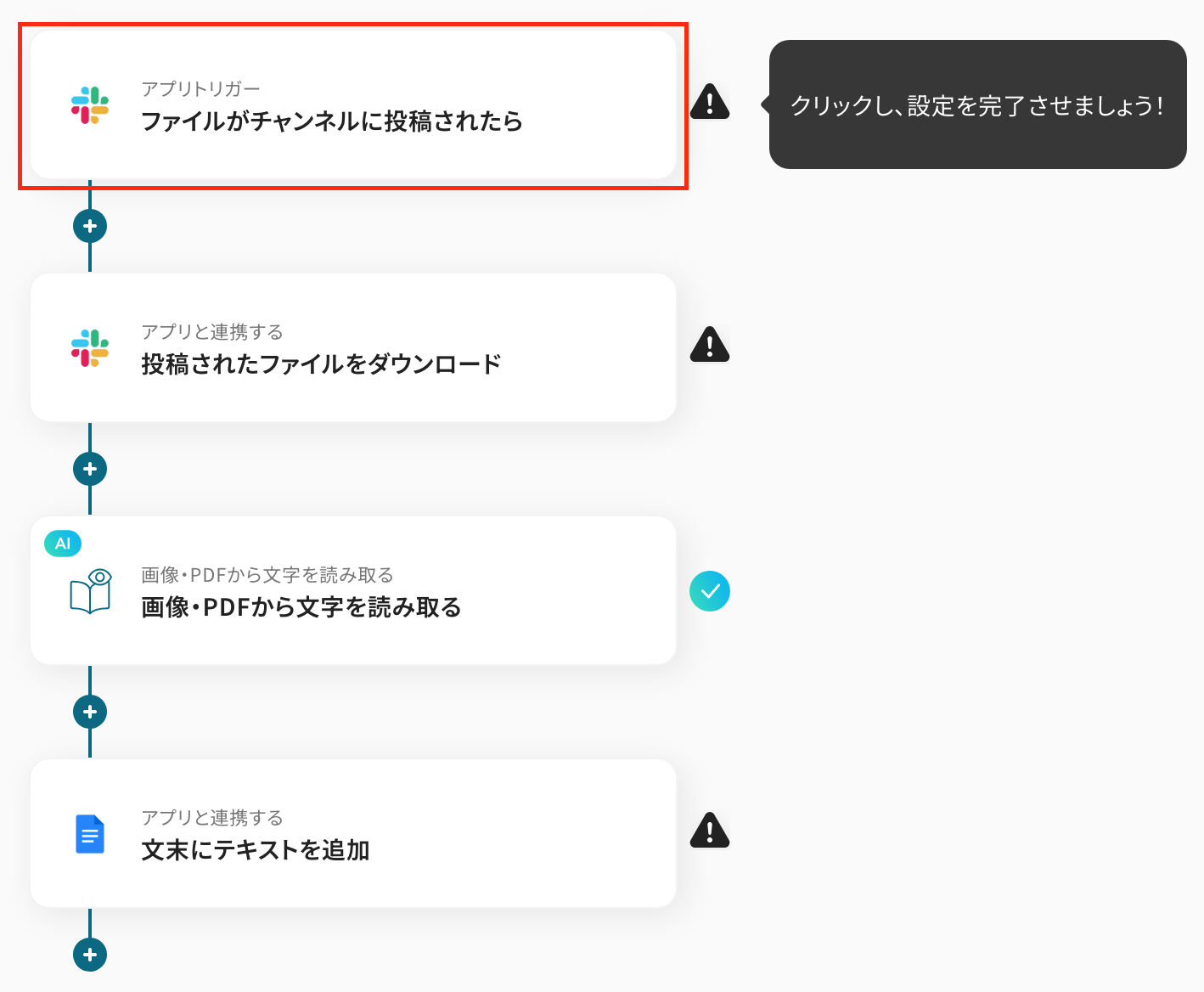 今回は例として「Slackに送信されたPDFをOCRで読み取り、Google ドキュメントに追加する」自動化フローの作成手順を例として解説します。このフローを使えば、Slackで受け取ったPDFの内容確認や転記作業から解放されるはずです!