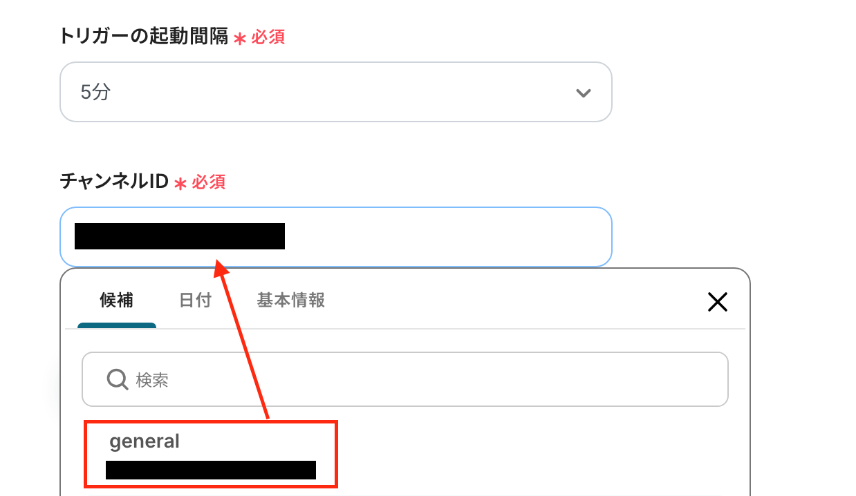 - 「チャンネルID」は候補から先ほどメッセージを送信したチャンネルを選択してください。以下の画像のように、入力欄をクリックして表示される候補から設定できます。