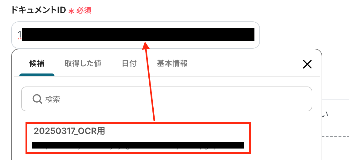 ドキュメントID:表示される候補から、書き込みたいGoogle ドキュメントを選択してください。