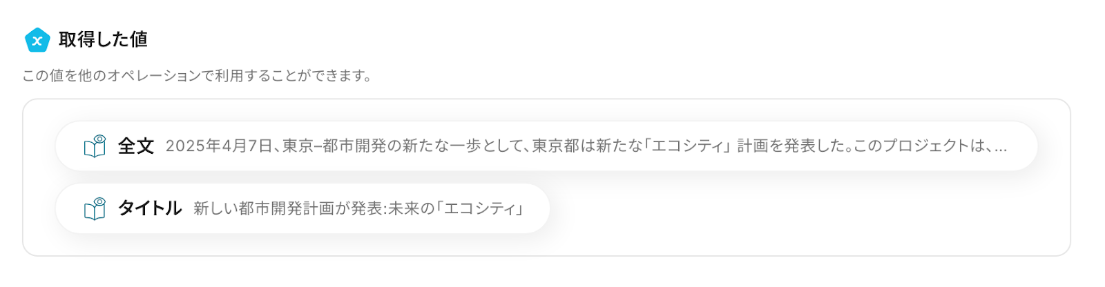 なお、ここで取得した値はアウトプットと呼びます。このアウトプットをGoogle ドキュメントに追加することが可能です!