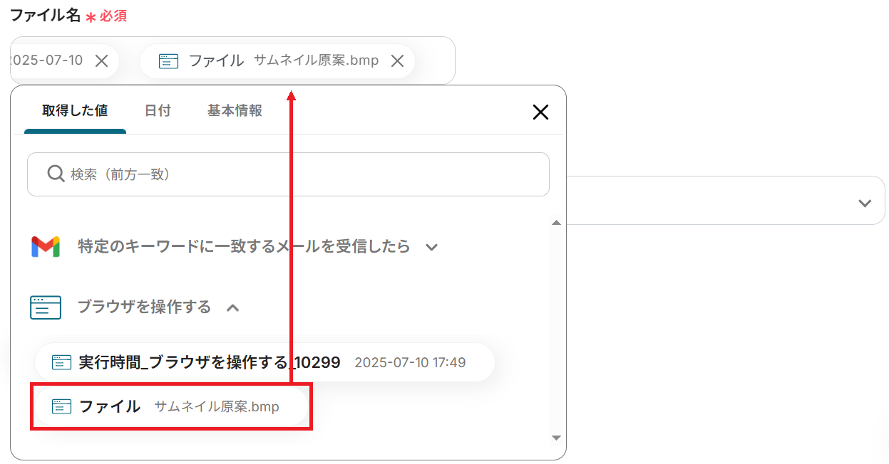 次に「ファイル名」を入力してください。日付や、ステップ4で変換したファイルのアウトプットを選択すると変数として利用できます。