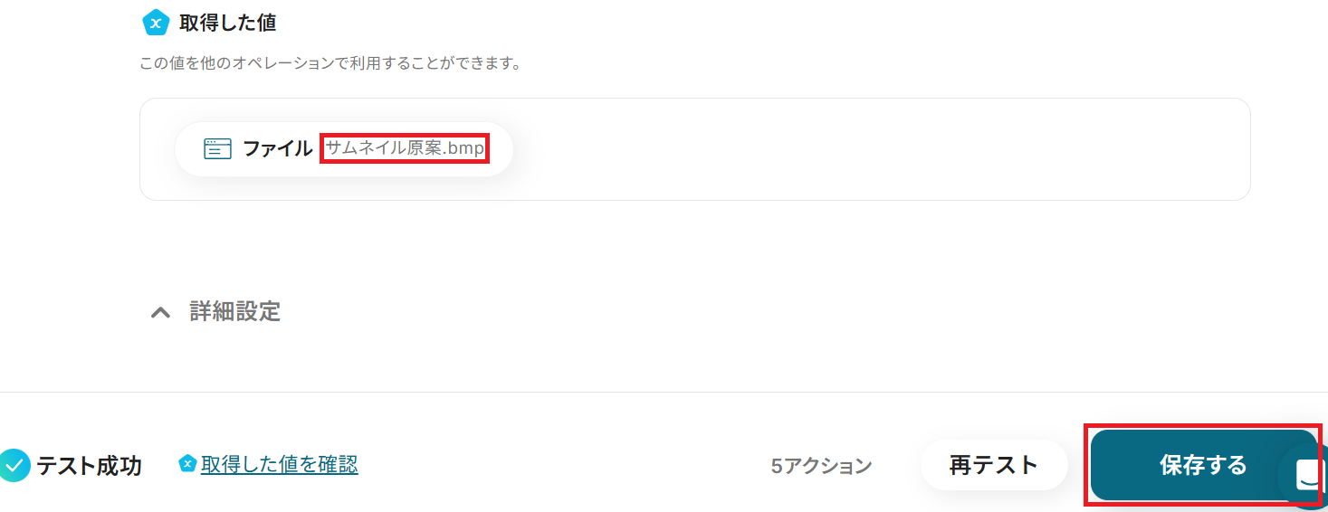 成功したら保存しましょう。ここで取得したアウトプット の値は次のステップで活用します。