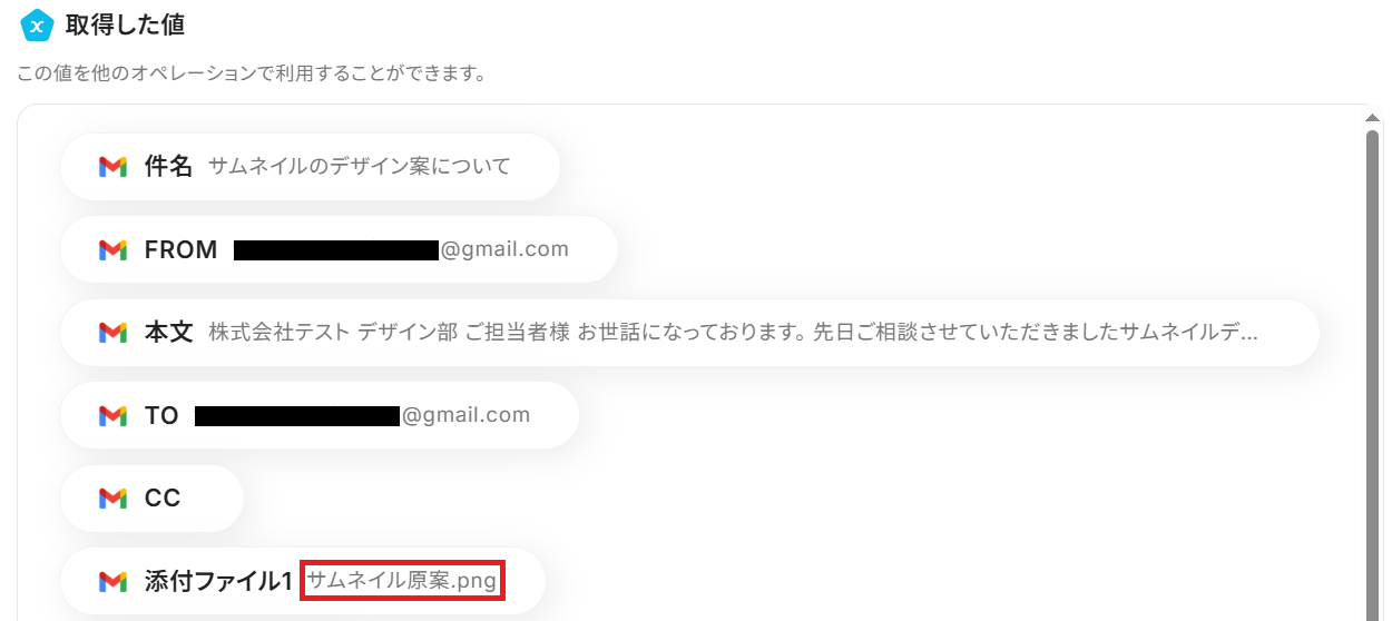 最後に、連携したGmailアドレスに上記のキーワードを含むPNGファイル付きメールを送信しましょう。 今回は以下のように、件名に「デザイン」というワードが入ったメールを送信しました。