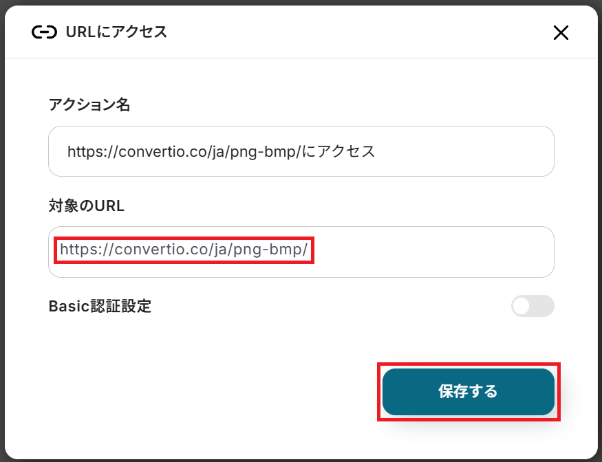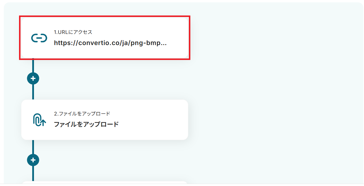 今回は操作例としてConvertioを使用していますが、用途や社内ルールなどに応じてURLをカスタマイズして使いましょう。 「1.URLにアクセス」をクリックし、任意のアクション名と対象のURLを入力して保存することでカスタマイズできます。