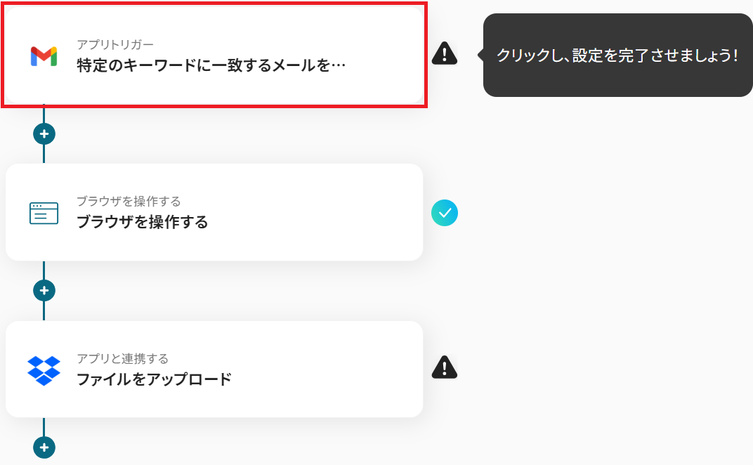 Gmailのトリガー設定、ファイル変換設定、Dropboxのアクション設定