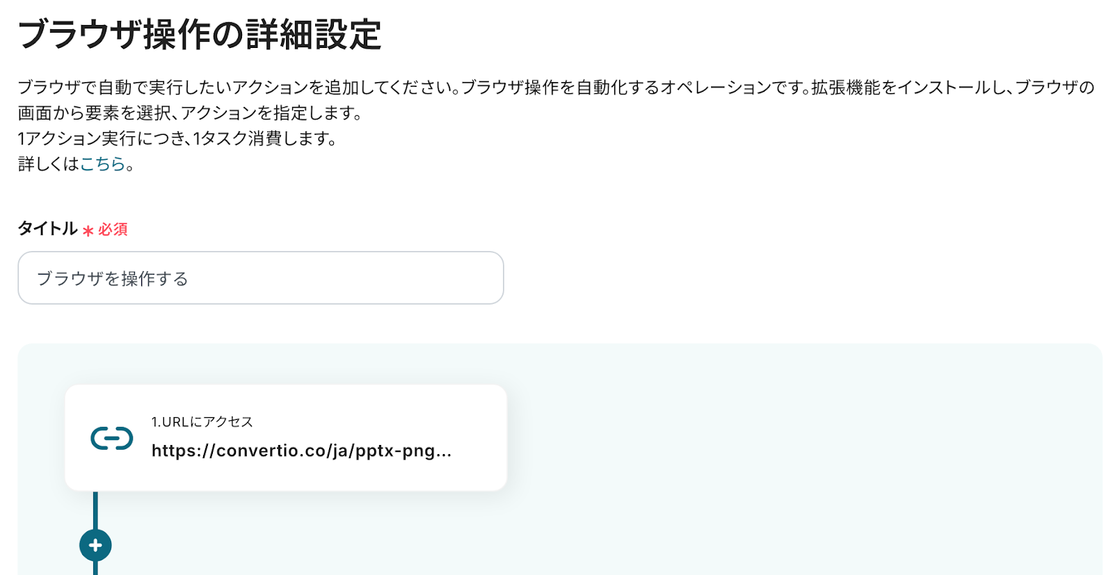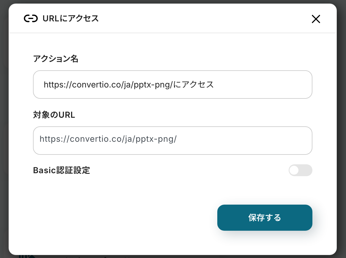 ※今回は操作例として、外部変換サイトを使用しています。用途や社内ルールなどに応じてURLをカスタマイズしてご利用ください。ご自身で指定したサイト上で、アクションを一つずつ設定していきましょう。なお、設定の方法はヘルプページを参考にしてください!