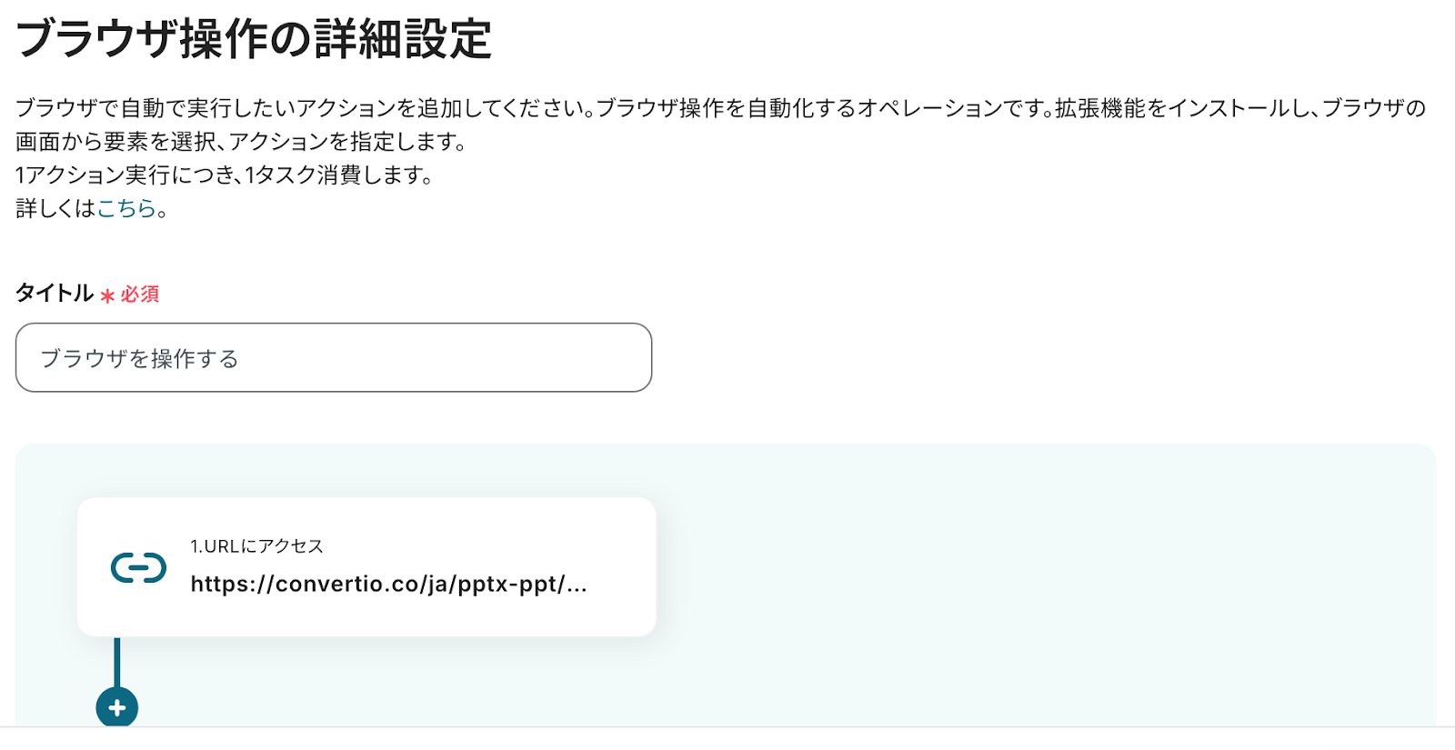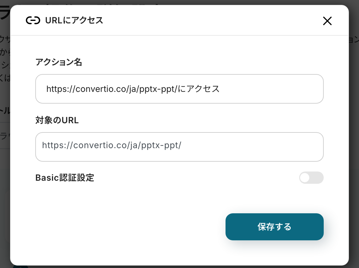 ※今回は操作例として、外部変換サイトを使用しています。用途や社内ルールなどに応じてURLをカスタマイズして使ってください。ご自身で指定したサイト上で、アクションを一つずつ設定していきましょう。なお、設定の方法はヘルプページを参考にしてください!