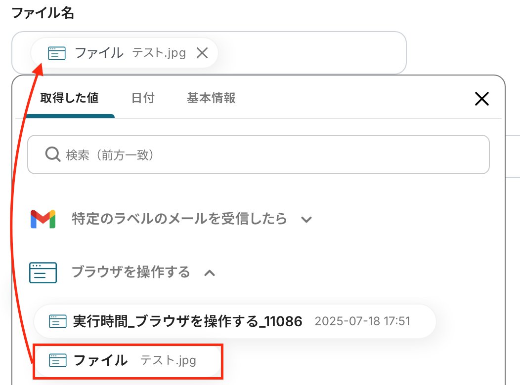 ファイルの添付方法: 「取得した値を使用する」を選択