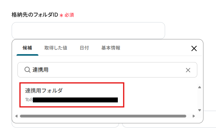 入力欄をクリックすると、連携しているアカウントから候補が表示されるため、対象となるフォルダを選択してください。