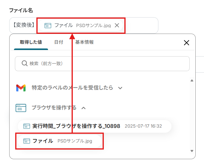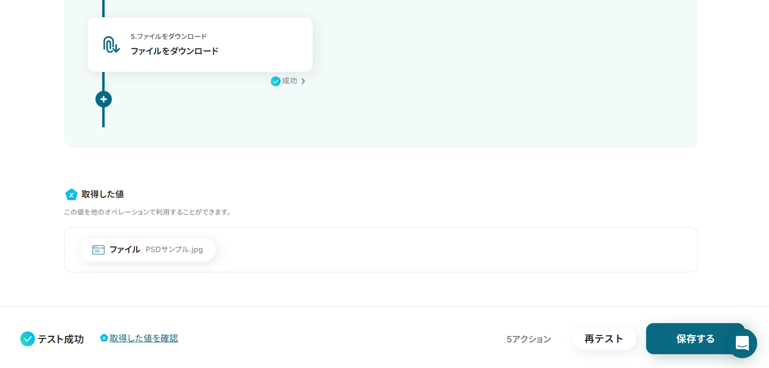 - テストに成功すると、「取得した値」にダウンロードしたファイルが追加されます。