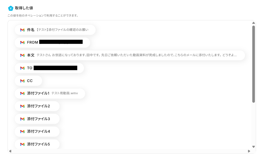 入力後、対象のGmail宛に実際にメールを送信し「テスト」をクリックしましょう!以下の画面のようにアウトプットにメールの内容が表示されます。