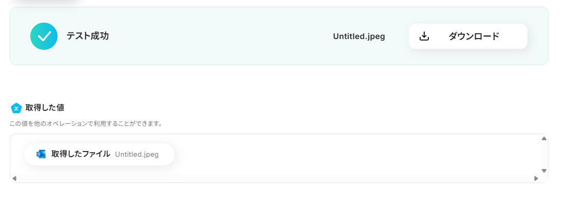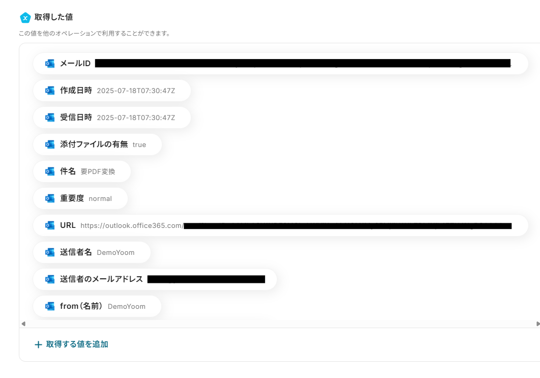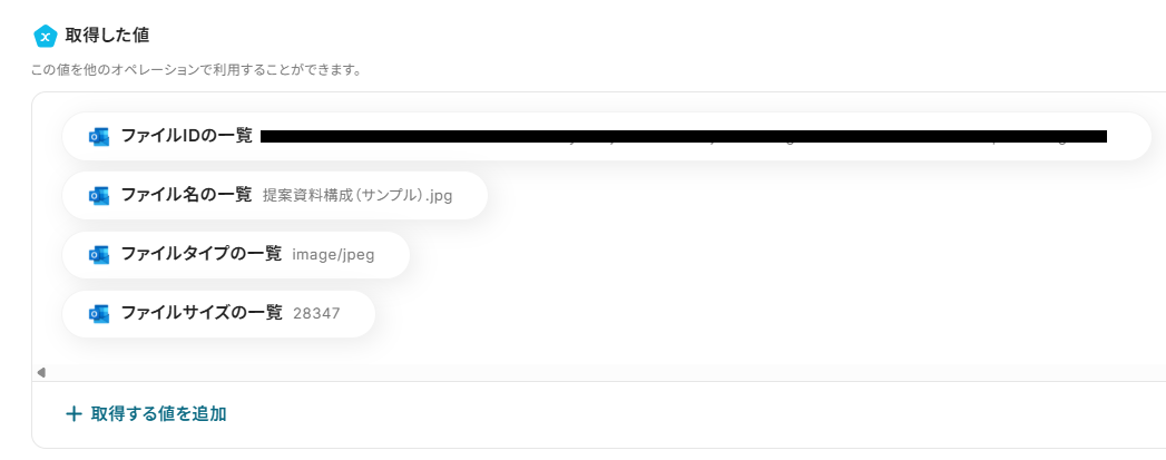トリガーやオペレーション設定時に、「テスト」を実行して取得した値です。