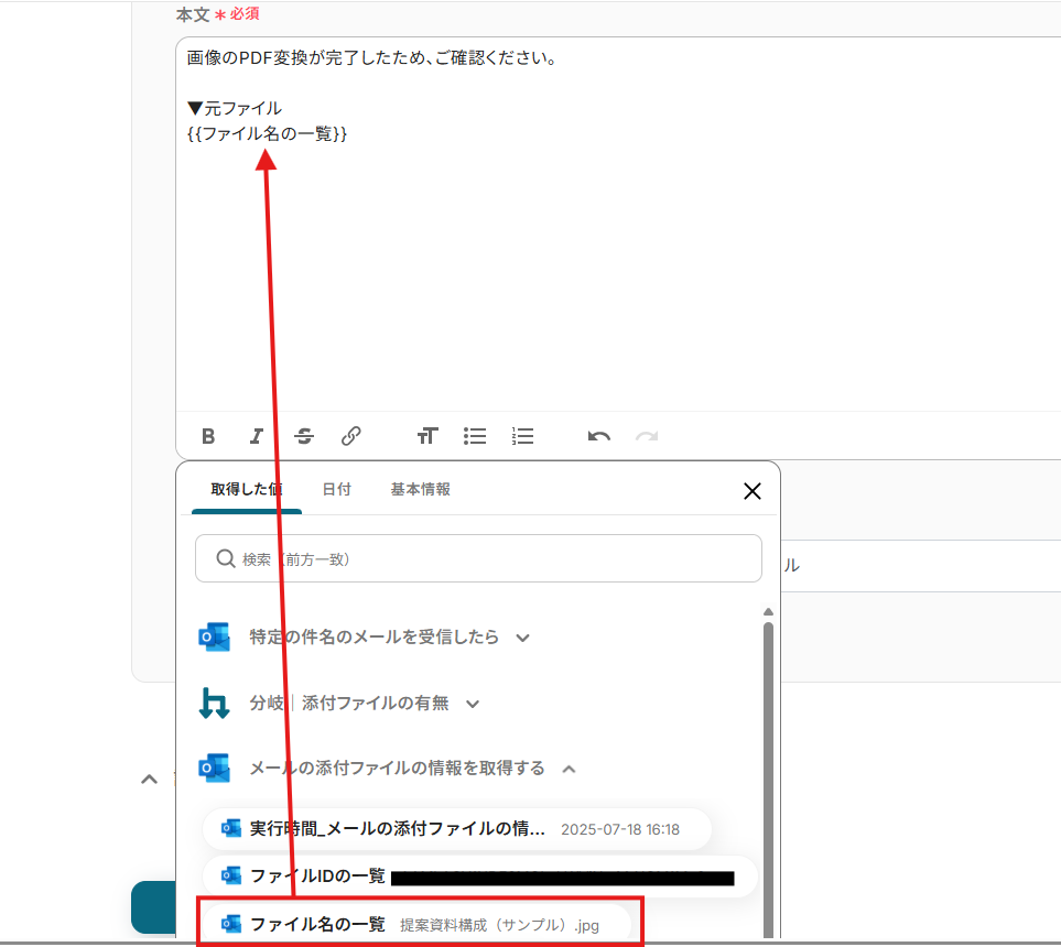 「本文」は、入力欄をクリックして表示される取得した値から選択してください。