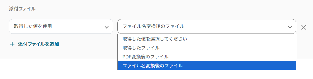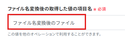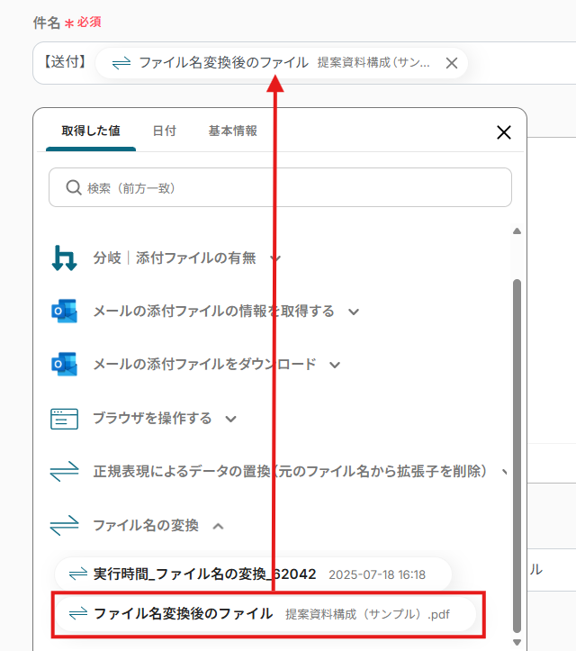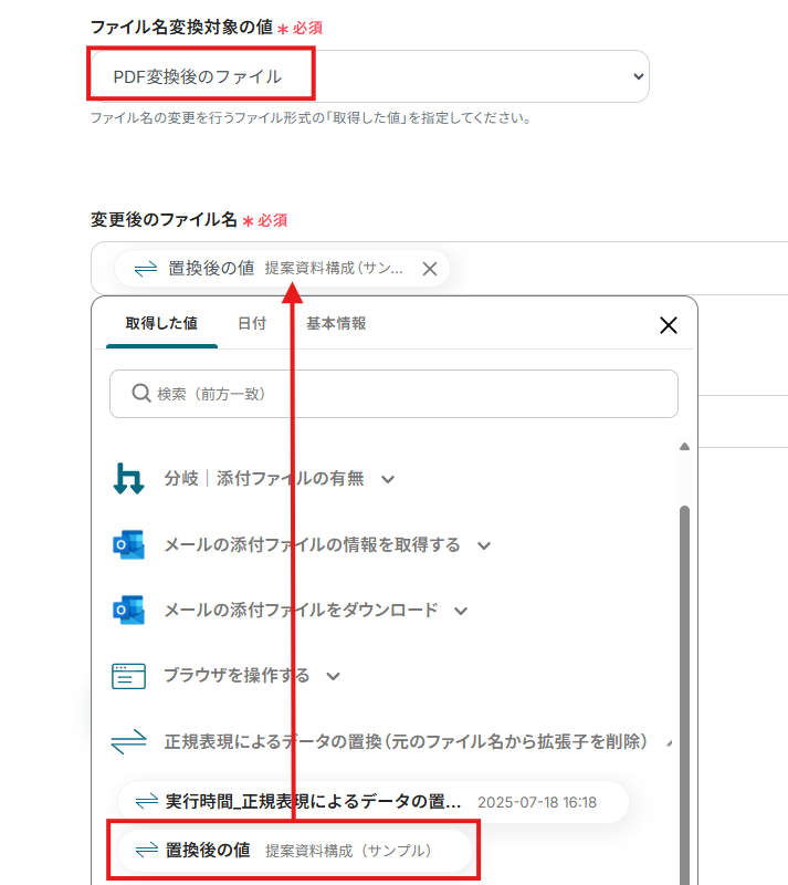 「変更後のファイル名」は、入力欄をクリックして表示される取得した値から選択してください。