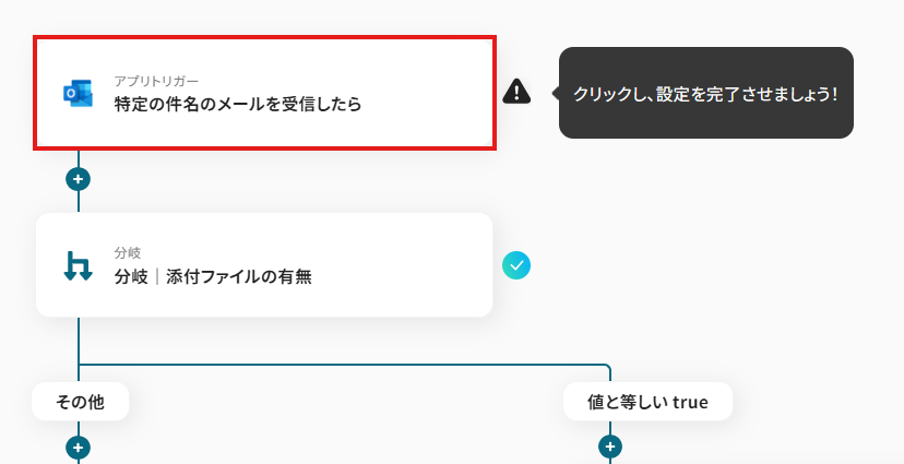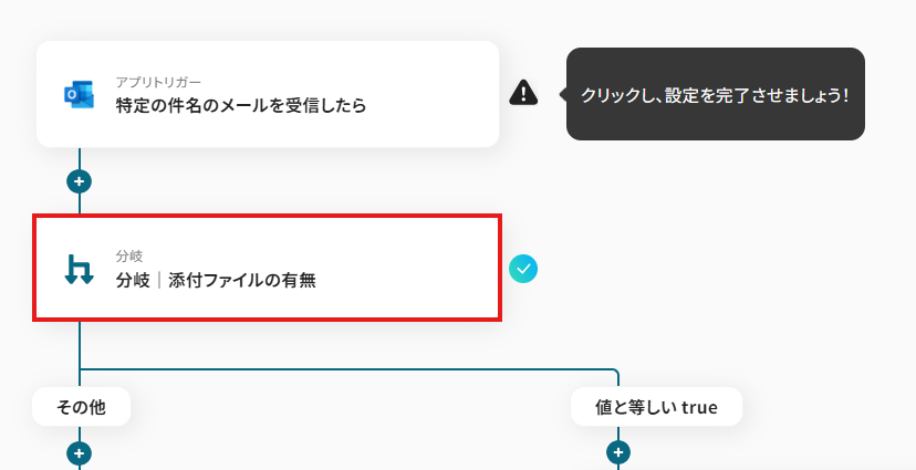 1.分岐「分岐|添付ファイルの有無」をクリックしましょう。