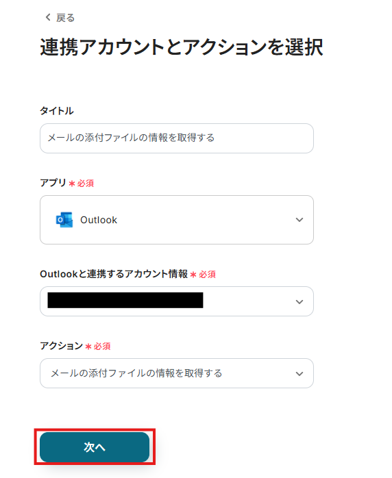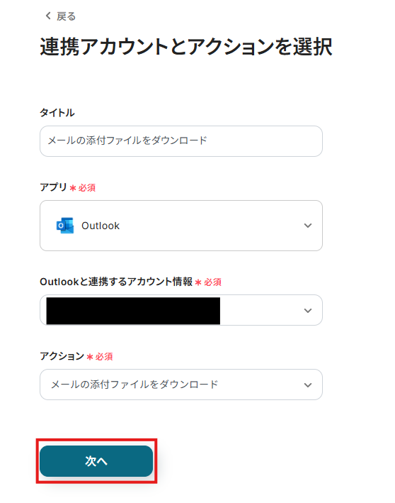 連携するアカウント情報には、ステップ1で連携したアカウント情報が反映されています。トリガーアクションはそのままにして、「次へ」をクリックしてください。