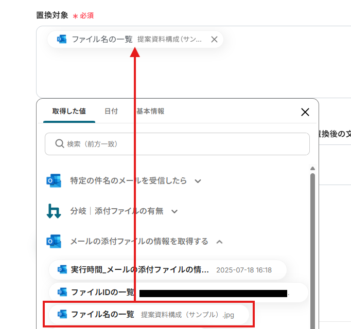 「置換対象」は、入力欄をクリックして表示される取得した値から選択してください。