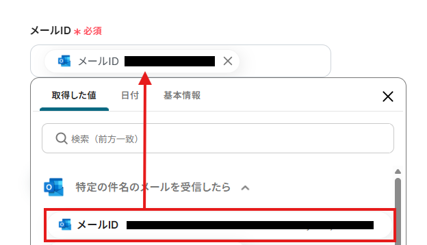 「メールID」は、入力欄をクリックして表示される取得した値から選択してください。