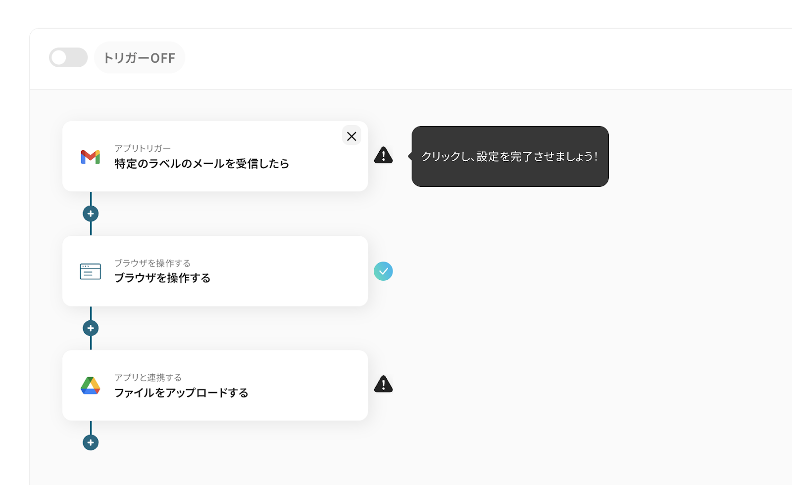 トリガーのON/OFFは左上のトグルから切り替えが可能です。プログラミング不要で、フローボットの設定が簡単に完了しました。