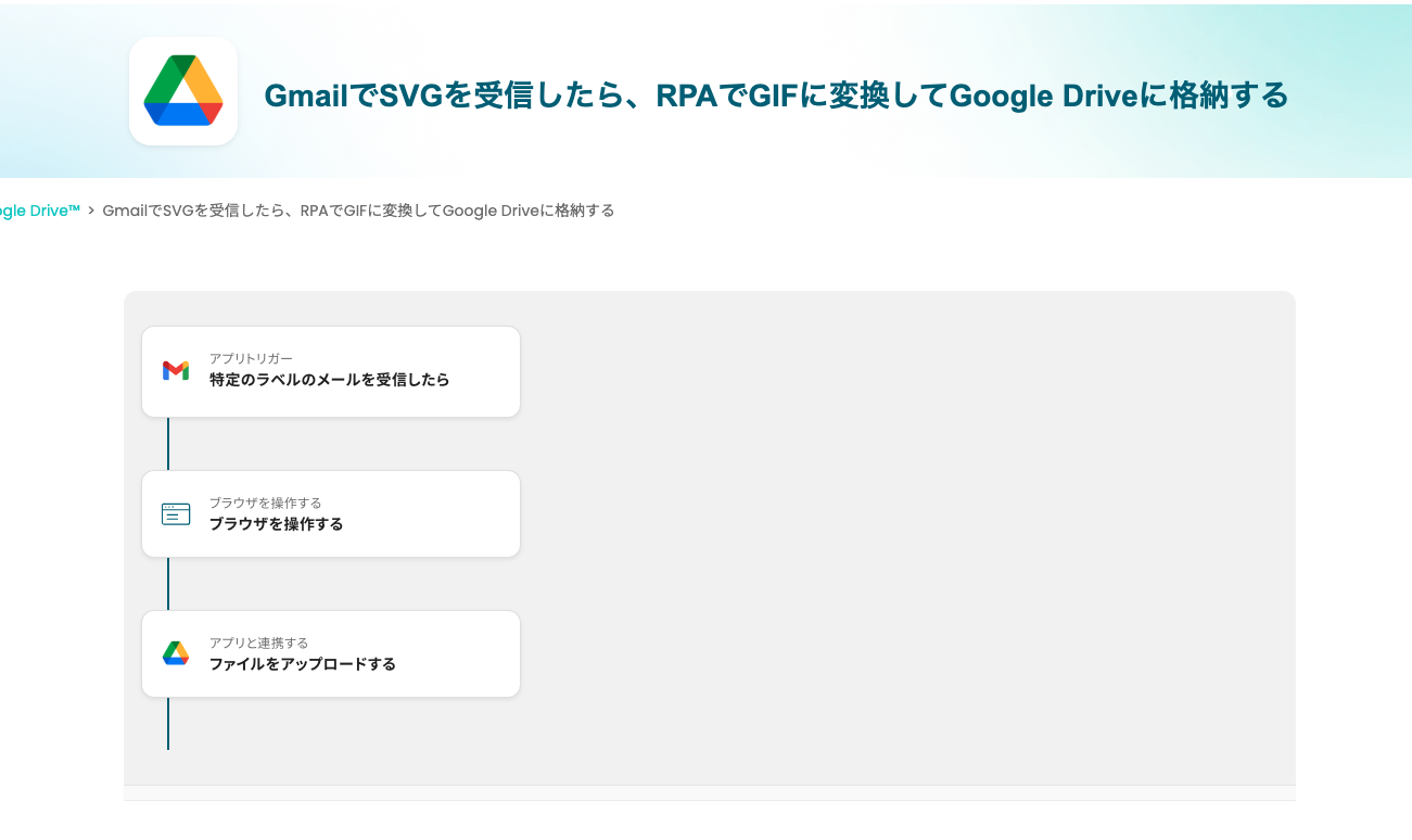 それではここから代表的な例として、Gmailで特定の条件に一致するメールを受信した際に、添付されたSVGファイルを自動でGIFに変換し、Google Driveに保存するフローを解説していきます!
