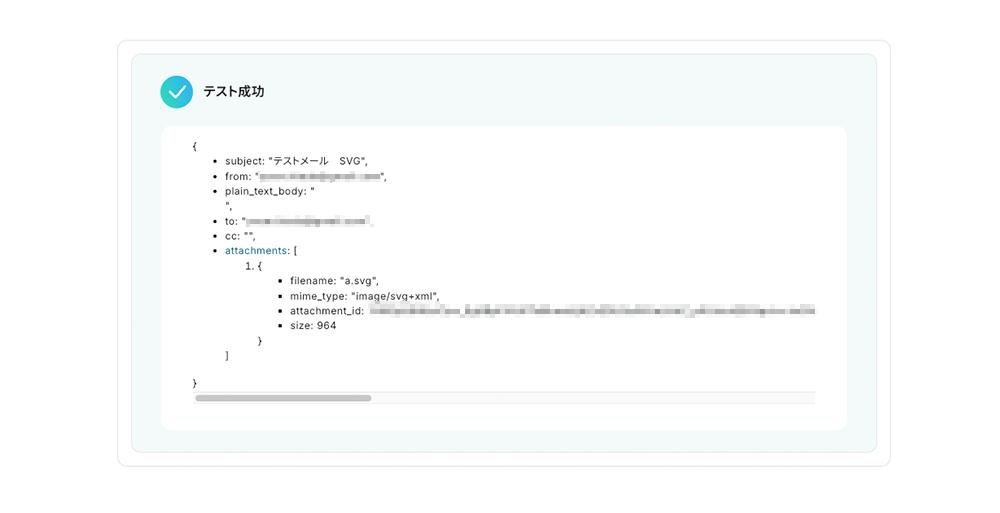 上の表示は、YoomとGmailが正常に連携でき、指定したラベルのメールを取得できたことが表されています。下へスクロールすると、取得できた項目・値が表示されます。