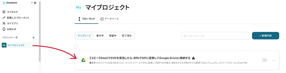 コピーしたテンプレートは、マイプロジェクトに追加されます。マイプロジェクトは左のメニューバーからアクセス可能です。